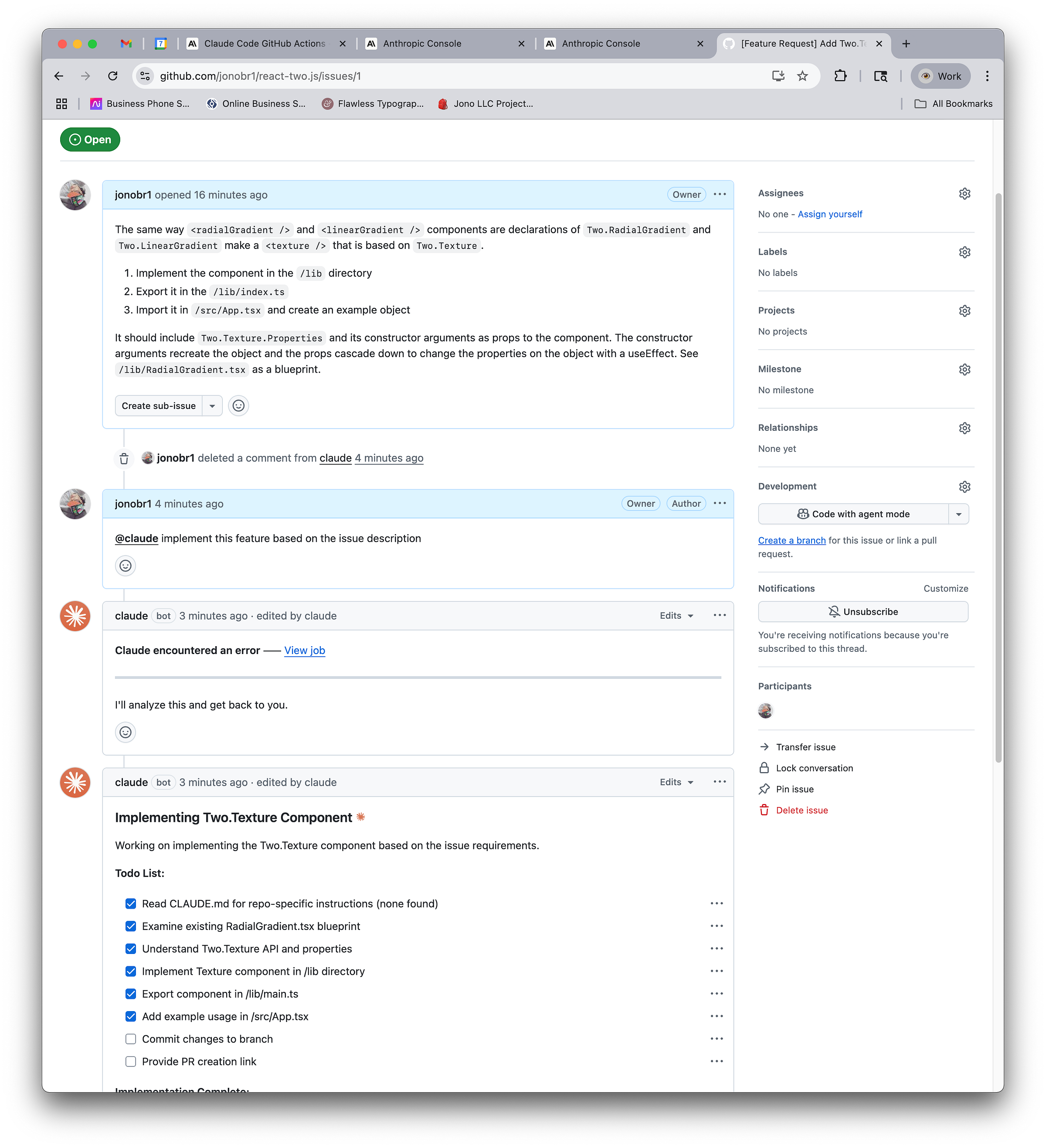 About this time last year, I started using Large Language Models (LLMs) like ChatGPT and Claude regularly for work. As a freelance type of collaborator, I found myself often in scenarios where I needed to get something done that was outside of my zone of expertise. I remember I used LLMs to build out header authentication for the microservices that support the Living Encyclopedia';5 definitely outside of my zone. This kind of need is too small to hire another person to help me out. In spring, I started using LLMs to help game plan projects: both client and personal ones. At the time, it felt like a kind of smart notebook. I could keep a tally of all my creative inquiries and have the LLM follow up on preliminary research for it. In the summer, I integrated LLMs into some of my source code repositories. This allowed me to asynchronously delegate tasks (particularly code related issues) to an LLM to do that I could then review. See the screenshot below. In autumn, I had LLMs build out end-to-end product roadmaps and then execute them. Again, the Living Encyclopedia became a testbed to develop a custom chat interface based on Matrix Chat’s protocol.6 Today, I use LLMs to offload a lot of work that I would have otherwise done myself. Tasks that would have taken a long time to do. AI is in my editors, connected to repositories, installed in my terminals, and I have AI apps downloaded to converse, search, and research for me. In all, I have spent north of $1,000 in the last year on various AI services and products. I have subscriptions and pay-per-use token charges by programmatically accessing AI services. They are mostly LLMs, but also educational material on how to prompt, and generative AI or GenAI services to produce images, videos, 3d models, audio, design artifacts, etc.. The landscape moves fast. And based on the initial boost I got last year, I have been motivated to try out services as they come out. I am constantly assessing whether a product or service improves or expands my workflow.